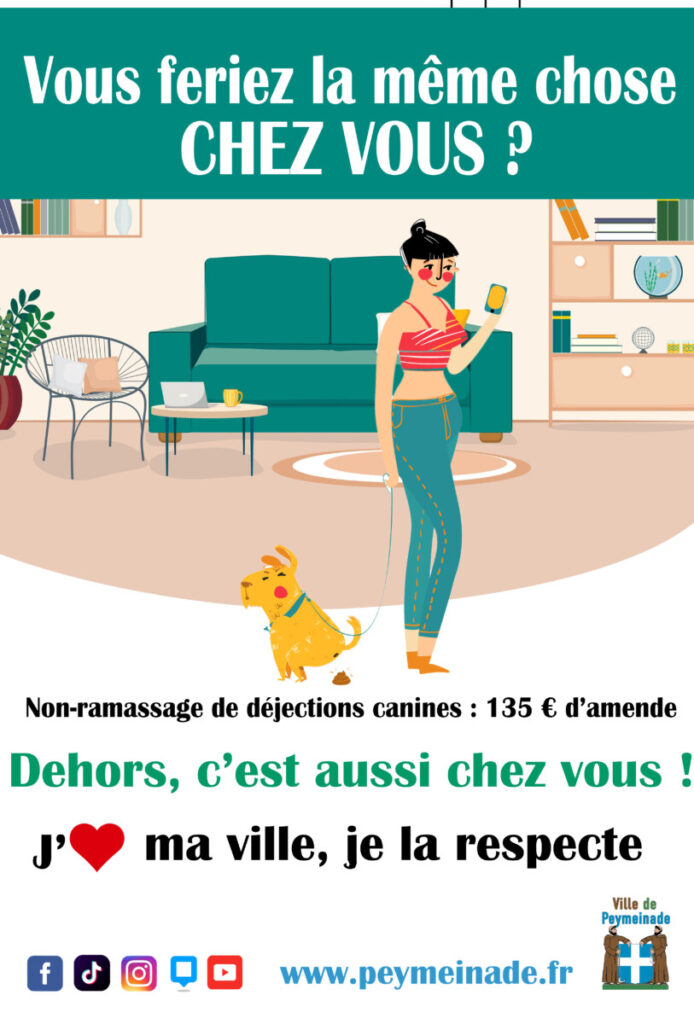 La seconde affiche s’attaque aux déjections canines laissées sur les trottoirs et dans les espaces publics. À travers un message direct et pédagogique, la ville rappelle que le ramassage des déjections est un acte de civisme élémentaire. L’objectif est d’inciter les propriétaires de chiens à se munir de sacs et à contribuer à maintenir les rues propres pour tous.