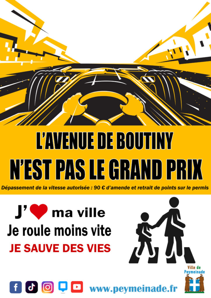 Enfin, le troisième visuel concerne la vitesse excessive dans certaines rues de Peymeinade. La campagne insiste sur l’importance de respecter les limitations de vitesse afin de garantir la sécurité des piétons, des cyclistes et des riverains. Le message se veut préventif et rappelle que la prudence au volant est l’affaire de chacun.