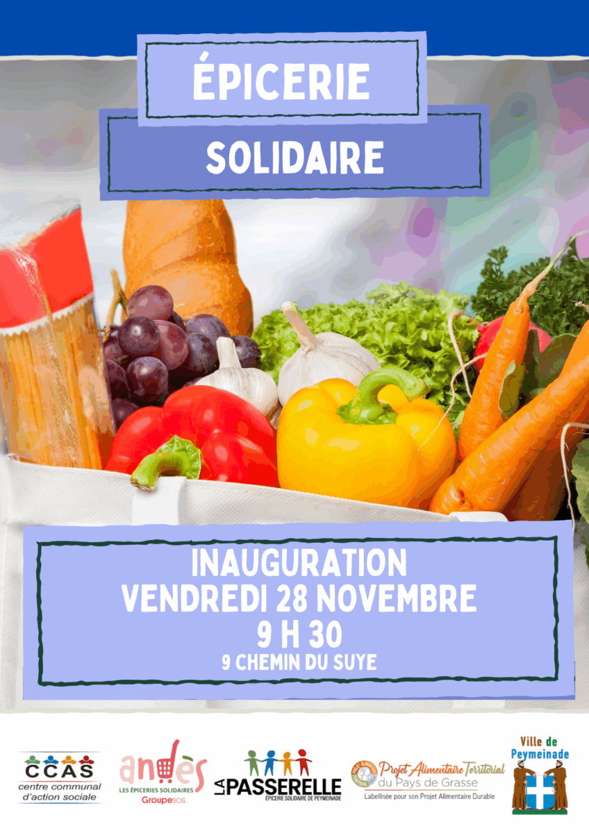 La Ville de Peymeinade et le CCAS ont le plaisir de vous convier à l’inauguration de la nouvelle épicerie solidaire, jeudi 28 novembre 2025 à 9 h 30 au 9 chemin du Suye.